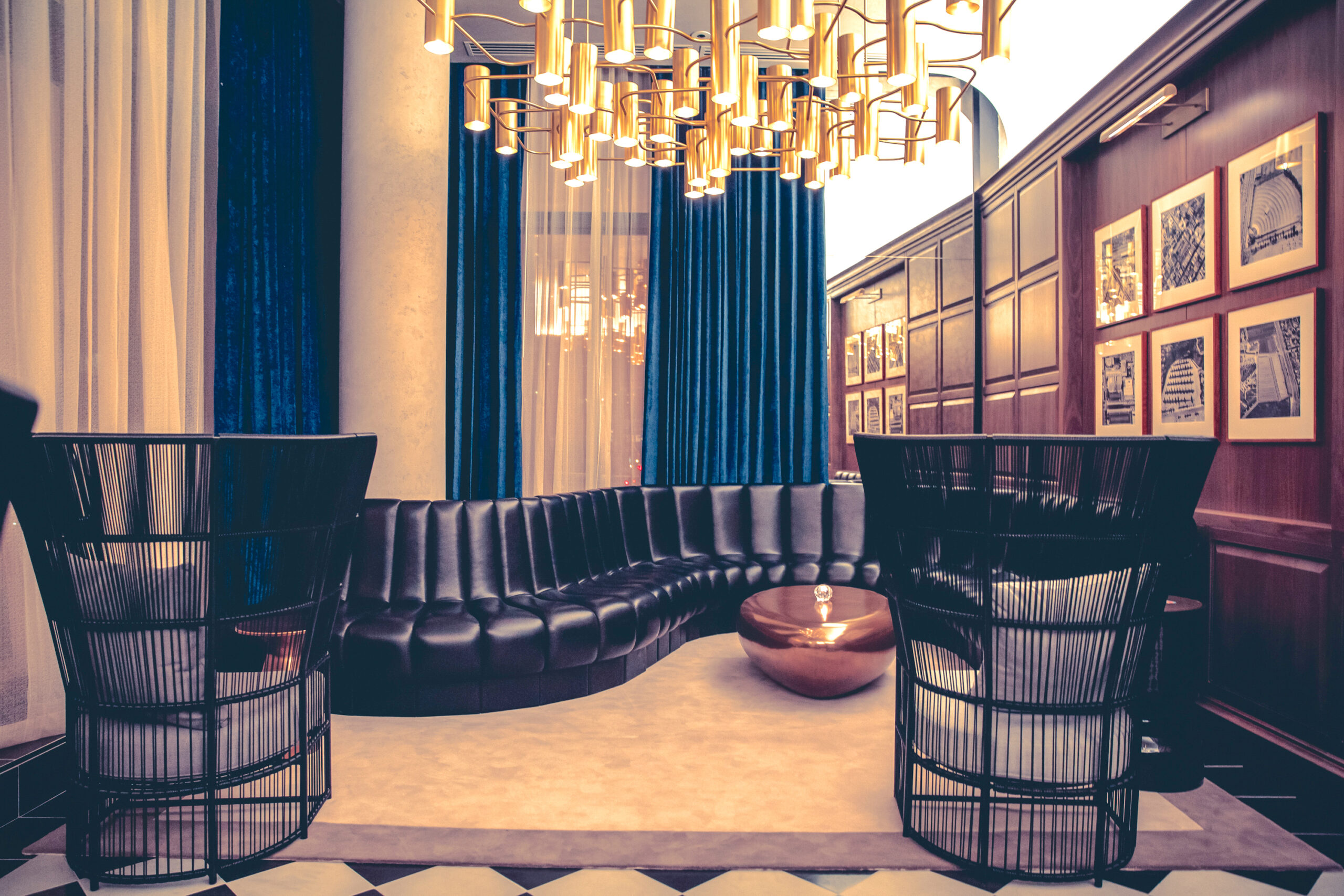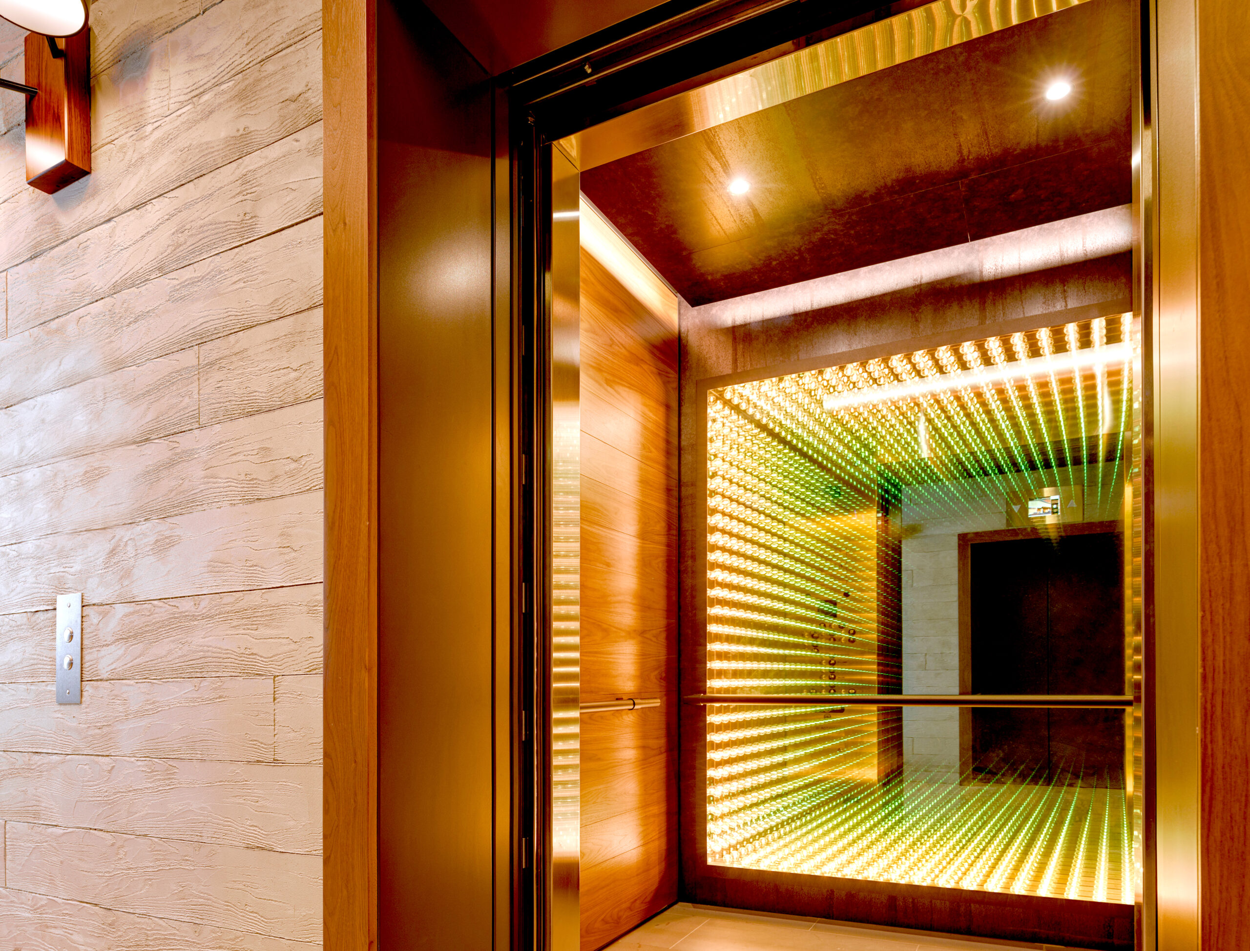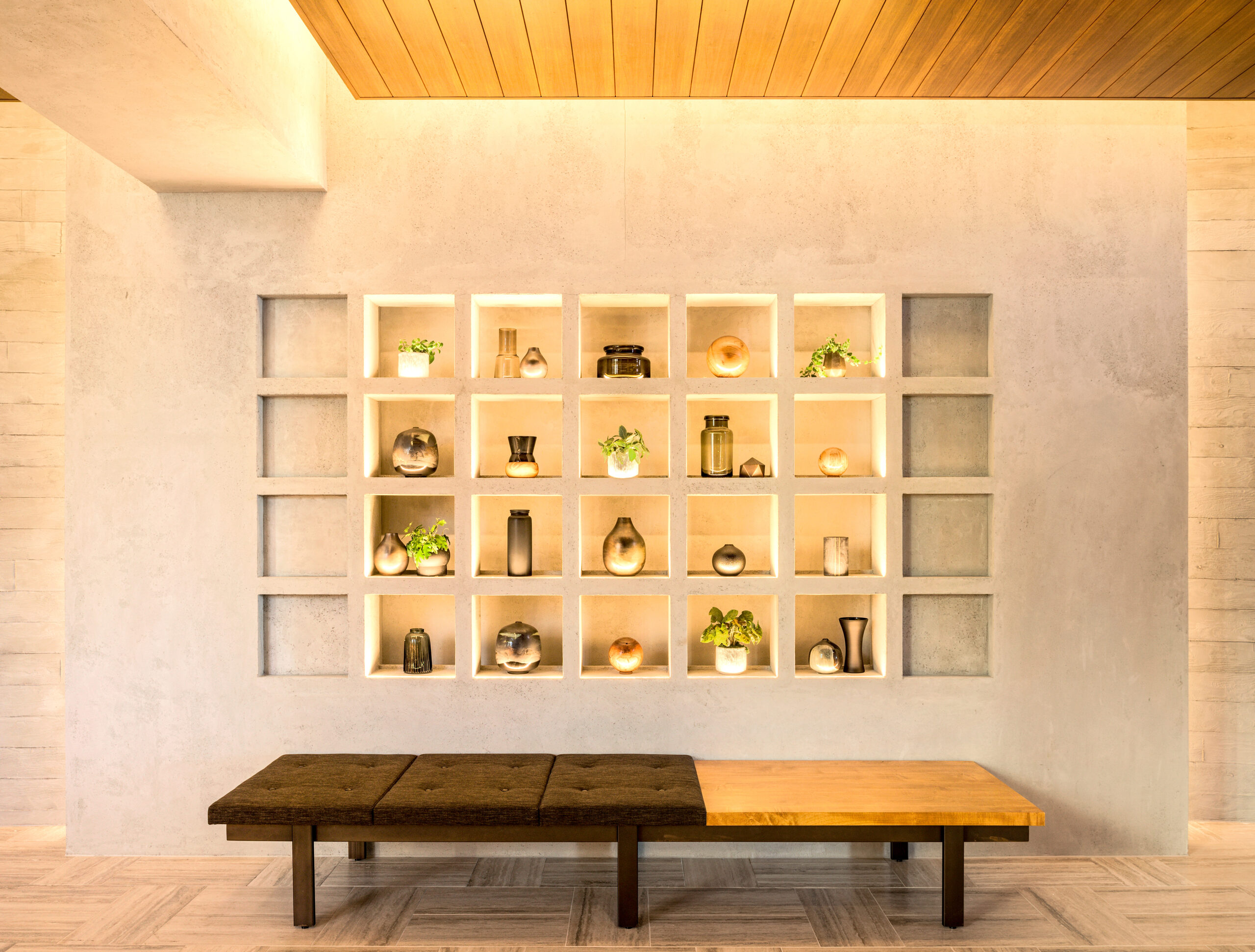 To access the lobby at the DOUGLAS, a private elevator bank with infinity mirror whisks you upstairs to the sixth-floor Park, a verdant oasis in the sky. Designed by landscape architect Christopher Phillips, the urban forest holds more than 200 pine trees and 15,000 local plantings. Stone and wood walkways wend through groves of trees surrounding a pristine pond while providing access to various rooftop bars and restaurants, as well as the hotel lobby.