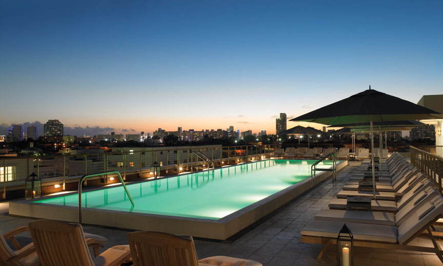 The Betsy’s spacious oceanfront Royal Suites are furnished in tropical plantation style with ceiling fans and walnut floors. Spa bathrooms of Carrera marble feature walk-in showers and bath mirrors with built-in LCD televisions. Classic barware complements curated guest libraries, so you can sip a Cuba Libre while reading Hemingway. On the Skyline Deck, a suspended lap pool hovers high above a courtyard atrium, so it’s like swimming laps in the air. Sunrise yoga on the rooftop segues nicely into a massage at the tranquil outdoor spa, where treatments utilize natural ingredients such as mandarins, blueberries, and sugar plums. As Hyam Plutzik wrote, “Expect no more. This is happiness.”