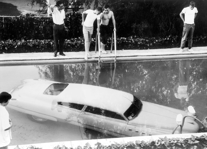 - 4th May 1961: A submerged car which its drunken owner ‘parked’ in a swimming pool in Beverly Hills, California, believing it to be a parking space. Nobody was injured in the process. (Photo by Keystone/Getty Images)